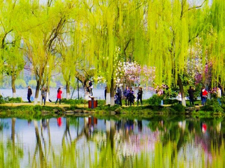 以青翠柳色和婉啭莺鸣作为公园景观基调,在沿湖长达千米的堤岸上和园路主干道路沿途栽种垂柳及狮柳,醉柳,浣沙柳等特色柳树。
