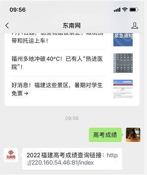 第二步:向东南网公众微信号发送关键词“高考成绩”到后台